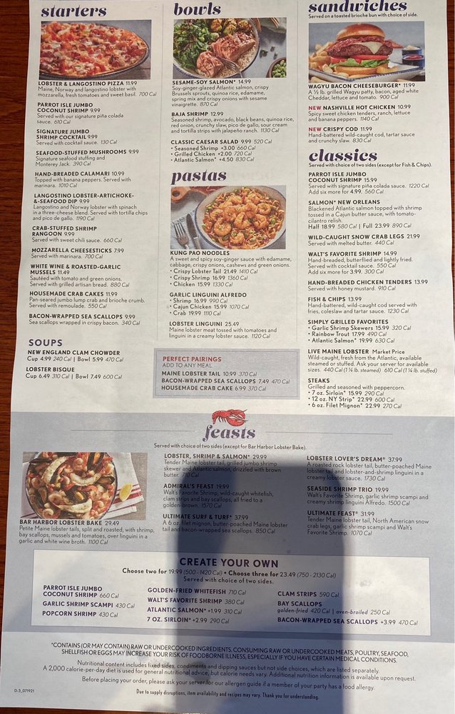 Walt's Favorite Shrimp (260 cal), Grilled Shrimp (250 cal), Garlic Shrimp Scampi (220 cal), Parrot Isle Jumbo Coconut Shrimp (470 cal), Shrimp Linguini Alfredo (620 cal)