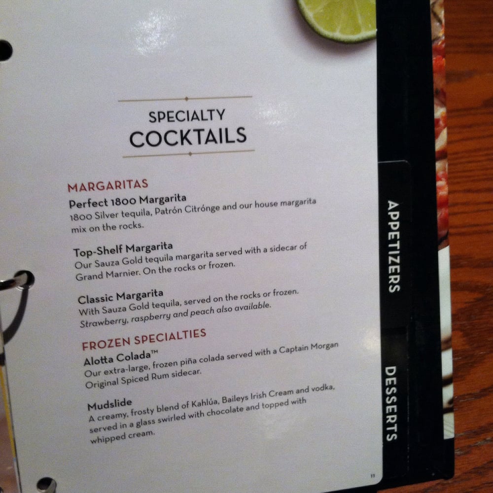 Sauza Gold Tequila, triple sec and Monin Passion Fruit Purée. Rocks (410 cal) | Frozen (360 cal)