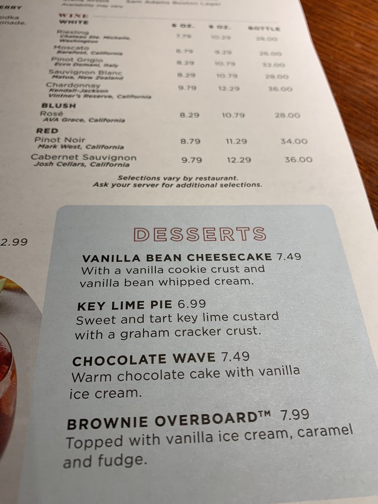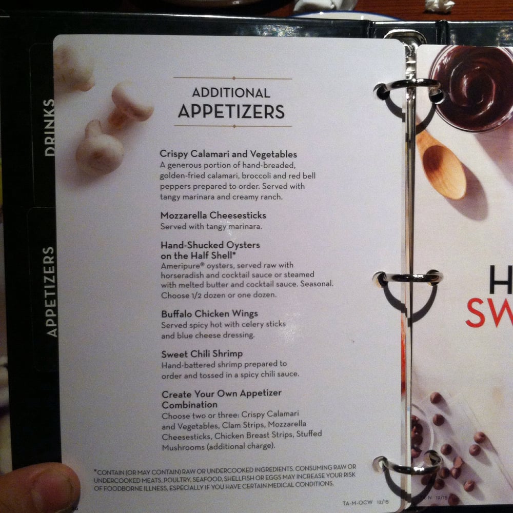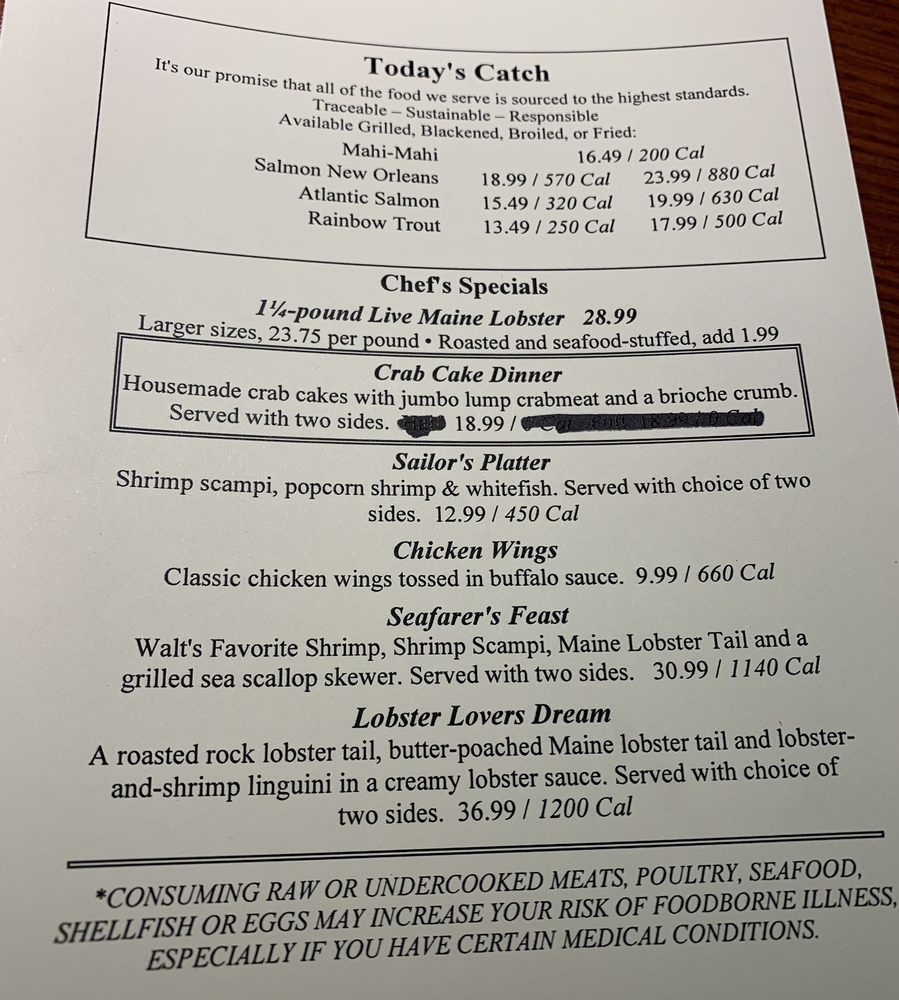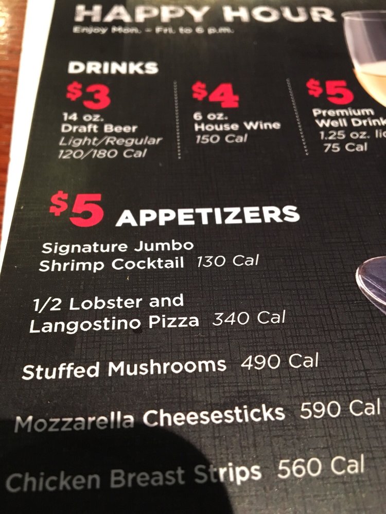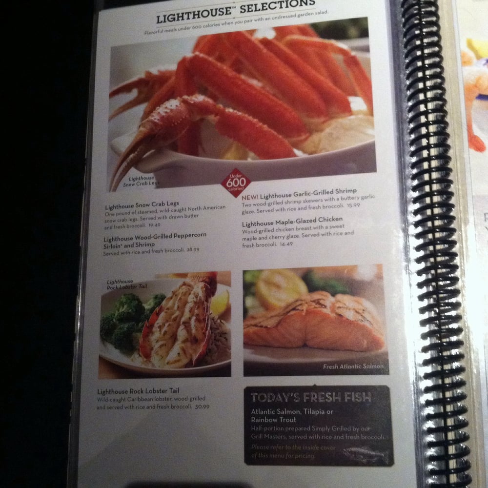 Snow Crab Legs (380 cal), Grilled Sea Scallops (280 cal), Maine Lobster Tail (420 cal), Atlantic Salmon* (510 cal), 7 oz. Sirloin* (320 cal)
